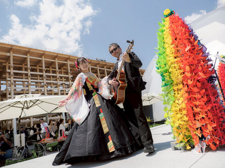 認知症の人や高齢者などが中心に折った約5万羽の折り鶴は、万博会場内の団体休憩所の壁面に飾られました。(五線譜の建物、オーストリア館の隣)